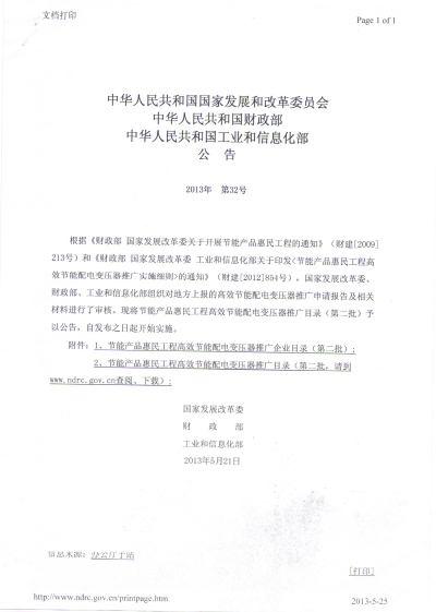 近日,國家發改委、財政部、工信部正式公布《節能產品惠民工程高效節能配電變壓器推廣企業目錄(第二批)》(http://www.ndrc.gov.cn/zcfb/zcfbgg/2013gg/W020130524556402255141.pdf ) ,我公司生產的節能配電變壓器成功入圍名單之列。