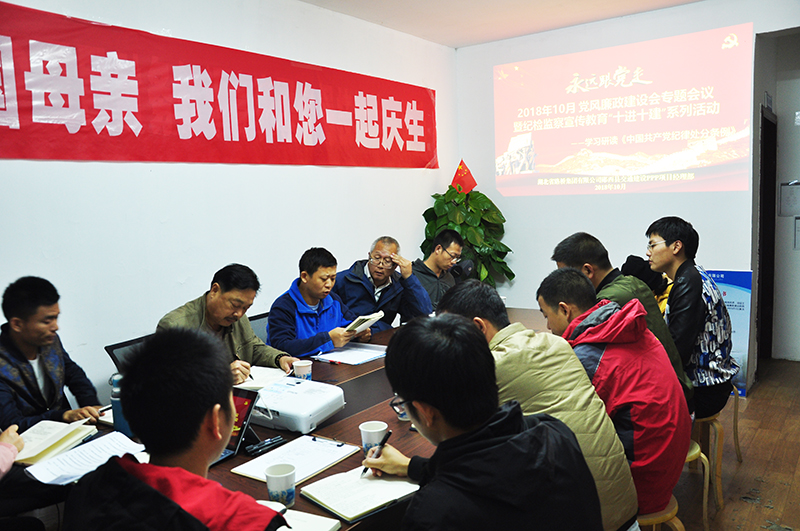 10月19日,為堅(jiān)持全面從嚴(yán)治黨,杜絕貪腐現(xiàn)象的滋生,湖北路橋鄖西PPP項(xiàng)目積極響應(yīng)集團(tuán)公司黨委的廉政號(hào)召,組織開(kāi)展了2018年10月黨風(fēng)廉政建設(shè)專(zhuān)題會(huì)議暨紀(jì)檢監(jiān)察宣傳教育“十進(jìn)十建”系列活動(dòng)。