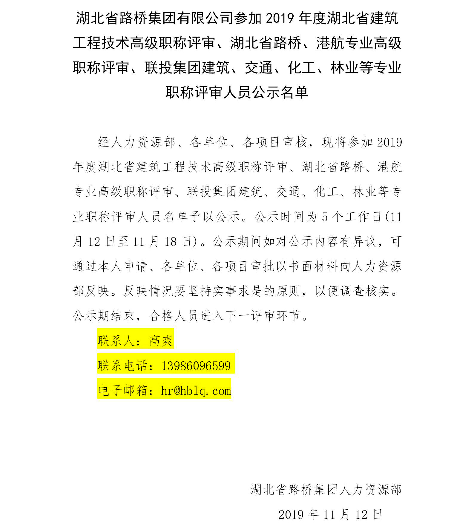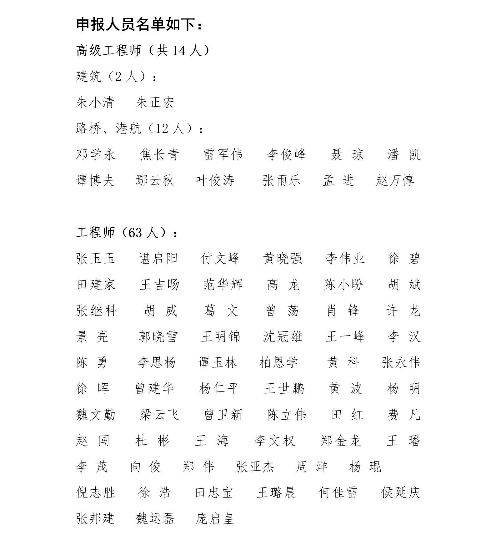 湖北省路橋集團有限公司參加2019年度湖北省建筑工程技術高級職稱評審、湖北省路橋、港航專業高級職稱評審、聯投集團建筑、交通、化工、林業等專業職稱評審人員公示名單