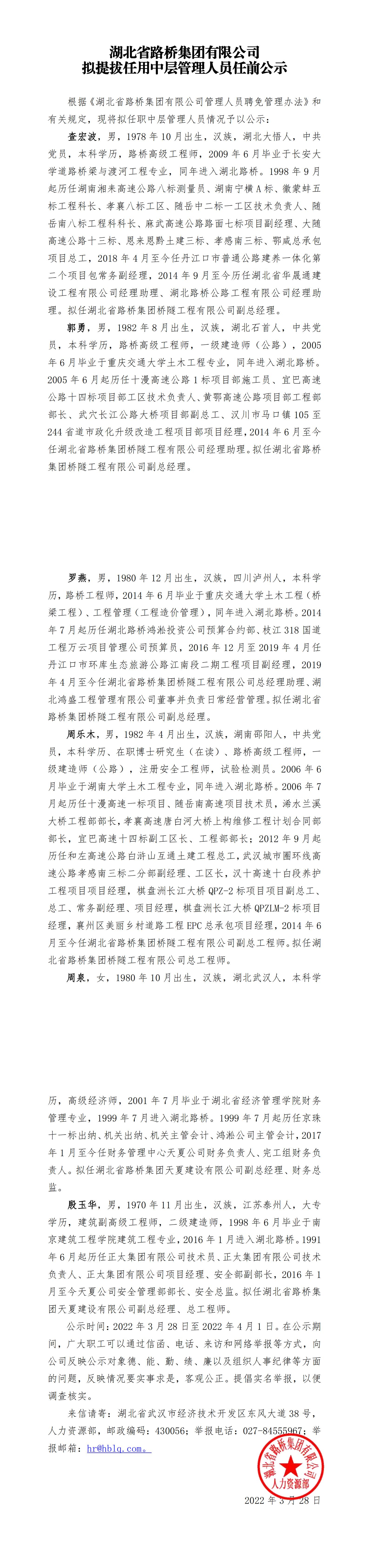 湖北省路橋集團有限公司擬提拔任用中層管理人員任前公示