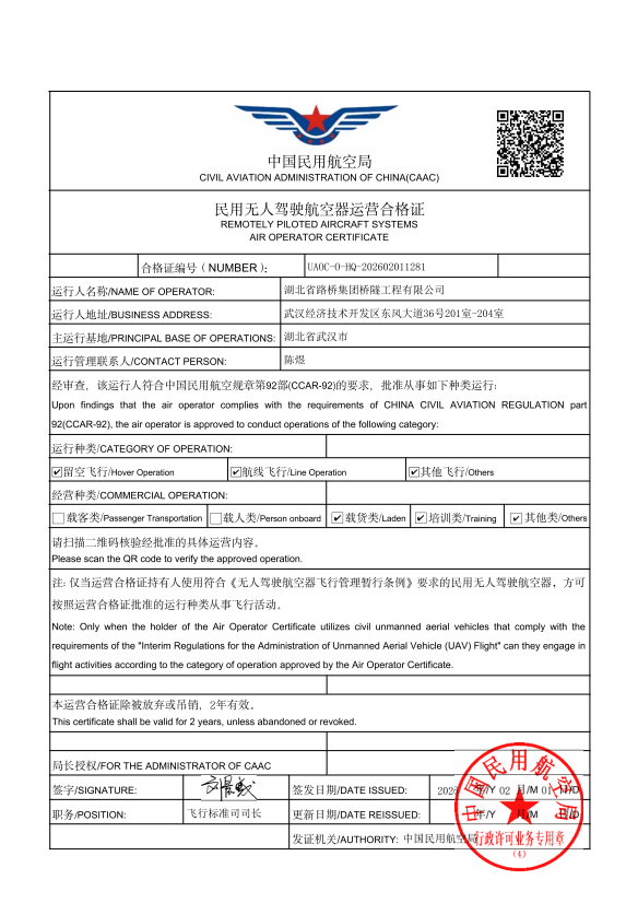 近日,橋隧公司測量監(jiān)測服務(wù)中心成功取得測繪乙級資質(zhì)(涵蓋工程測量、界線與不動(dòng)產(chǎn)測繪、攝影測量與遙感專業(yè))和民用無人駕駛航空器運(yùn)營合格證,為橋隧公司進(jìn)一步完善業(yè)務(wù)布局、提升綜合服務(wù)能力、拓寬市場領(lǐng)域注入新動(dòng)能。