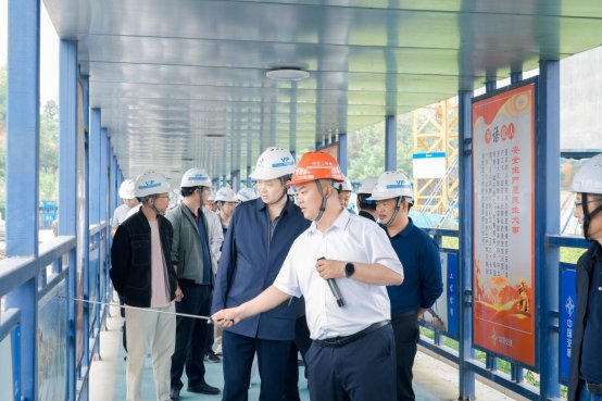 朱紅明一行先后參觀了鄂州側(cè)主塔、錨碇、智慧梁場(chǎng),燕磯長(zhǎng)江大橋YJTJ-3項(xiàng)目總工程師羅航對(duì)超大錨碇基礎(chǔ)施工、一體化智能筑塔機(jī)+鋼筋部品化、復(fù)雜地質(zhì)大直徑超長(zhǎng)樁基成孔施工、不同垂度四主纜懸索橋主纜及主梁架設(shè)等先進(jìn)建造技術(shù)作現(xiàn)場(chǎng)講解。