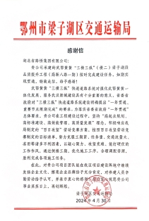 圖:梁子湖區(qū)交通運(yùn)輸局感謝信????圖:梁子湖大隊(duì)表揚(yáng)信