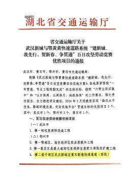 近日,湖北省交通運(yùn)輸廳發(fā)布兩則關(guān)于武漢新城與鄂黃黃快速道路系統(tǒng)建設(shè)的通報(bào),由湖北路橋承建的吳楚大道項(xiàng)目、高新八路一期項(xiàng)目分別獲評年度“紅旗”項(xiàng)目、百日攻堅(jiān)勞動(dòng)競賽優(yōu)勝項(xiàng)目。