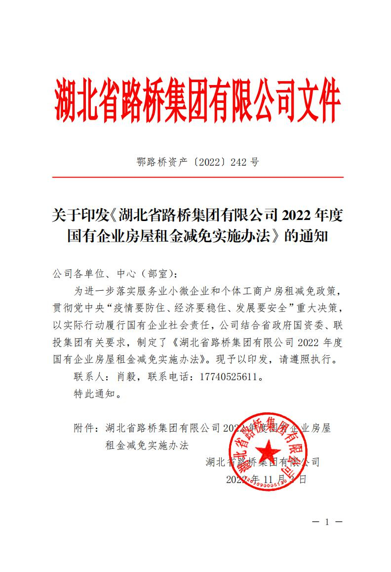 關于印發《湖北省路橋集團有限公司2022年度國有企業房屋租金減免實施辦法》的通知