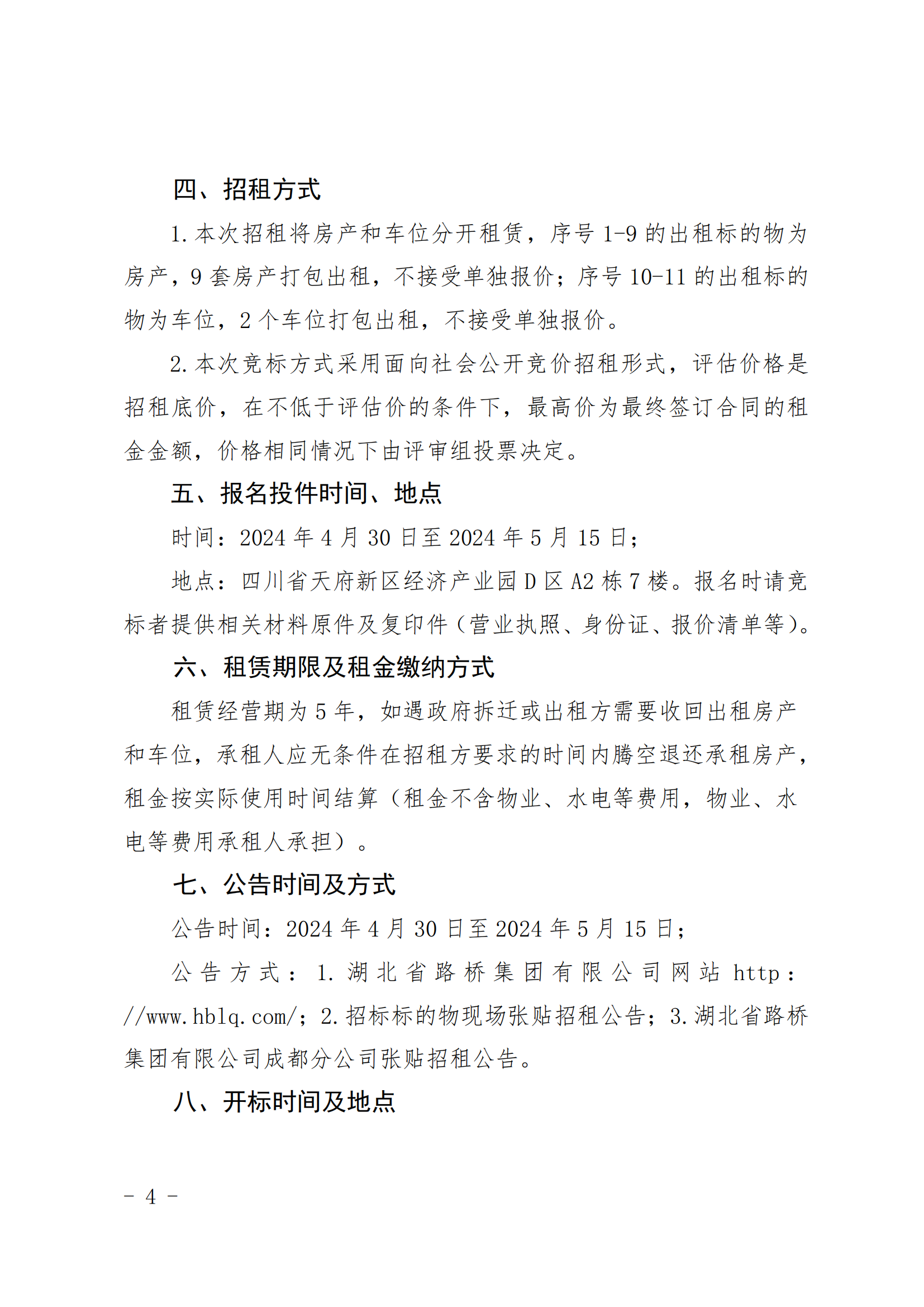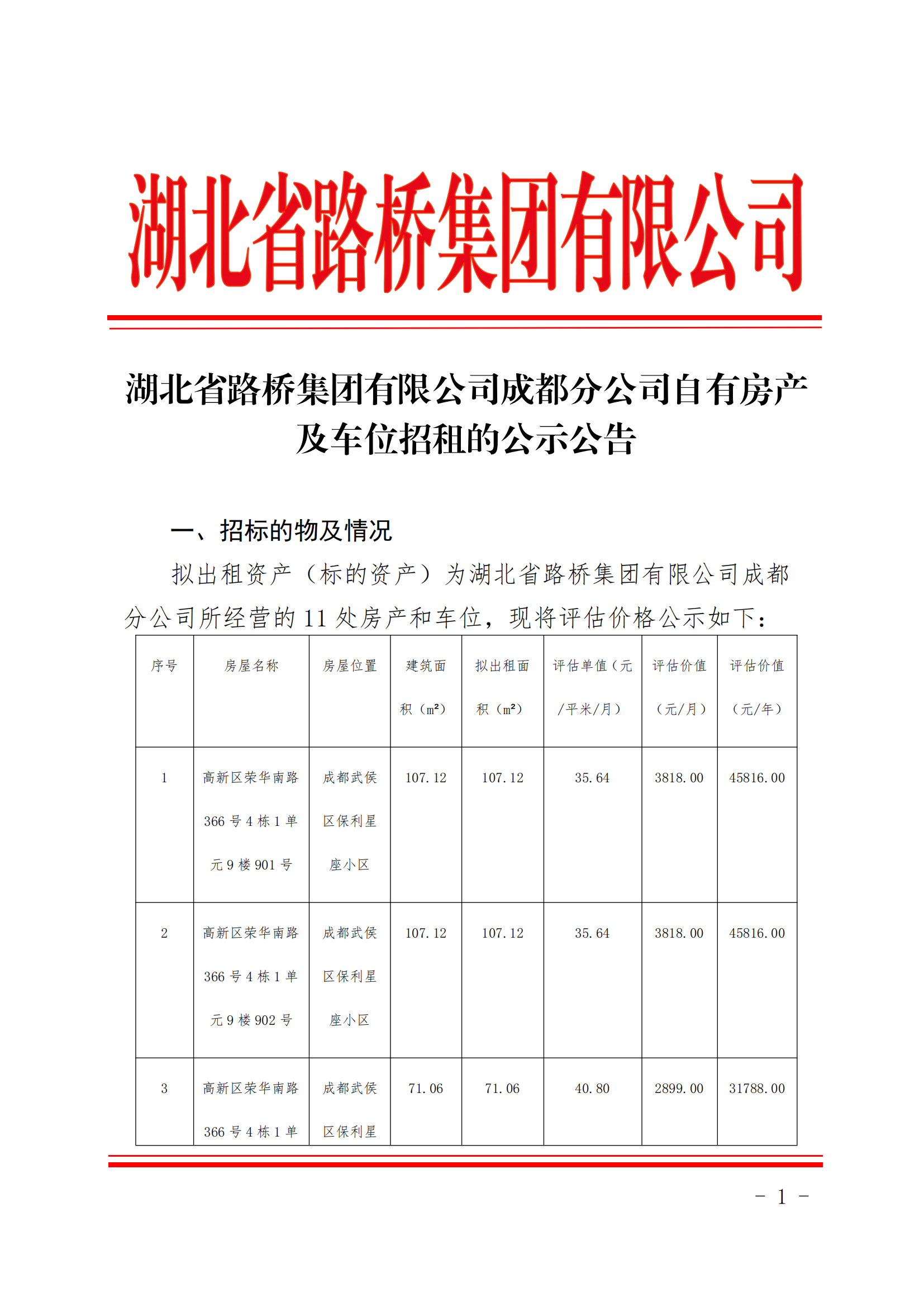 湖北省路橋集團(tuán)有限公司成都分公司自有房產(chǎn)及車位招租的公示公告